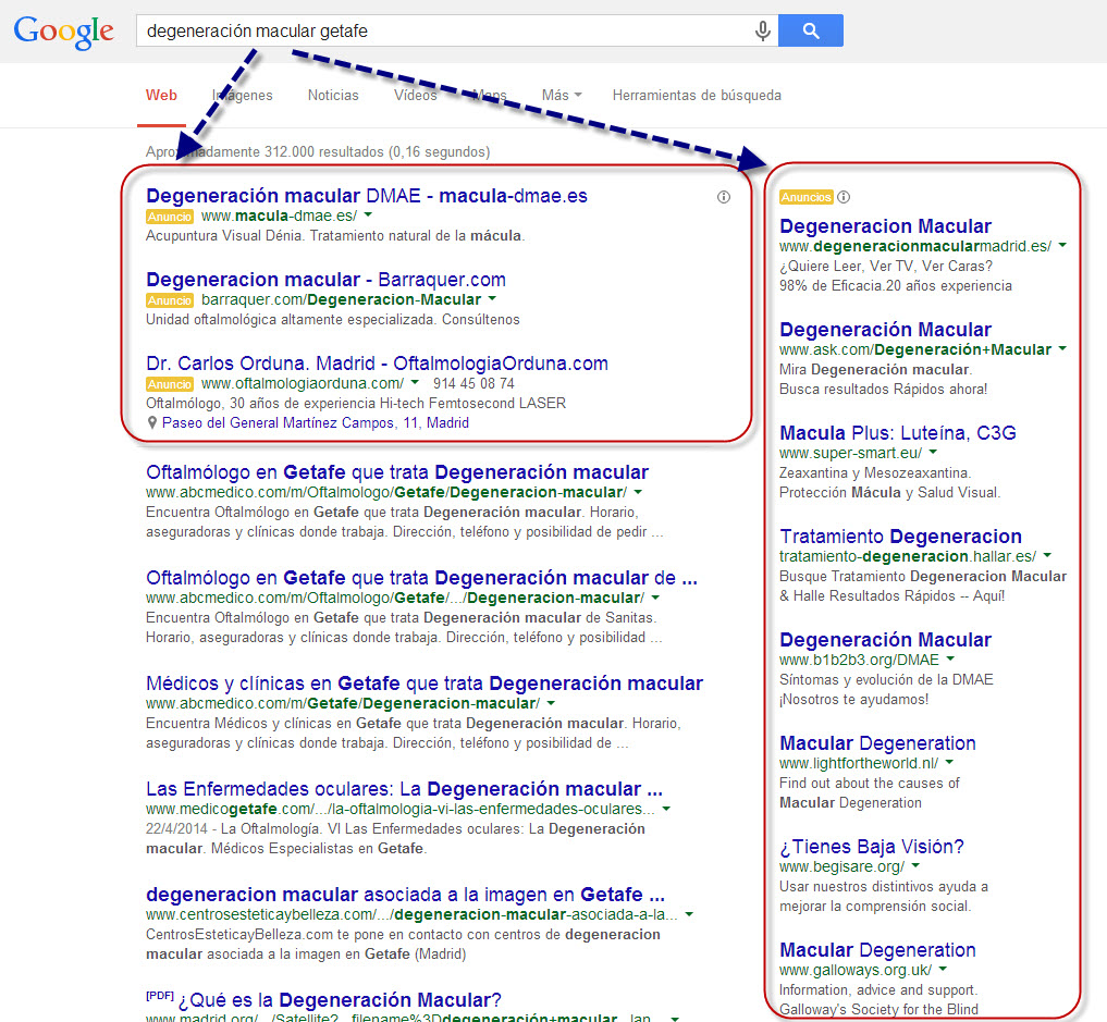 Ejemplo: Un oftalmólogo de Madrid que presta servicio en Getafe y Leganés quiere captar pacientes de estas localidades que demanden tratamiento de degenaración macular asociada a la edad y de cirugía de cataratas. Le interesa que vean su anuncio entre semana en horario de consulta.